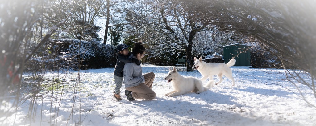 Nous sommes un couple passionné par le Berger Blanc Suisse, une race qui nous accompagne depuis de nombreuses années et qui est au cœur de notre projet d’élevage. Je m’appelle Nathalie et mon conjoint Benoît. J’ai grandi entourée de chiens, et le Berger Blanc Suisse s’est imposé très tôt comme une évidence, tant par son équilibre que par la relation profonde qu’il permet de construire avec l’humain. Benoît n’avait jamais vécu avec un chien avant l’arrivée de Delta, mais il s’est à son tour pleinement investi dans cette aventure, partageant aujourd’hui la même exigence et la même sensibilité quant au bien-être et au développement du chien. Après plusieurs années passées à Bordeaux, nous nous sommes installés à Challex, au pied du Jura, où nous vivons désormais avec nos chiens et notre enfant. Notre quotidien est organisé de manière à garantir une présence attentive, une stabilité émotionnelle et un cadre sécurisant pour nos chiens et leurs chiots.