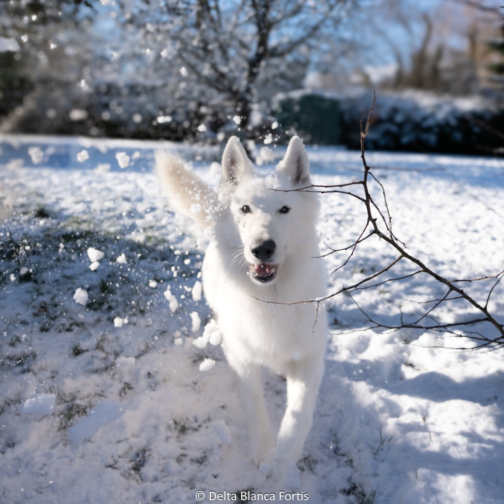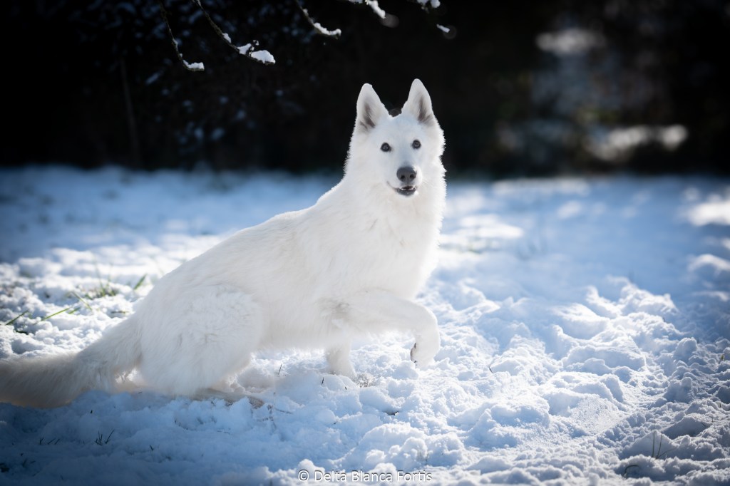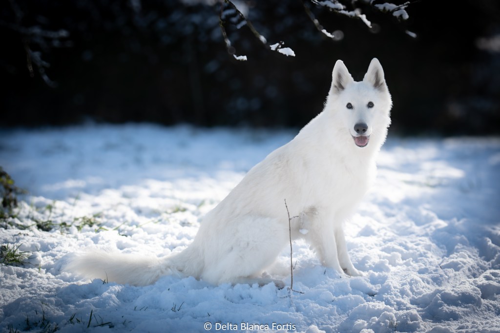 Très bonne pigmentation, yeux et griffes, un poil long et blanc, c’est un petit gabarit pour le moment, 61cm pour 30 kg.
